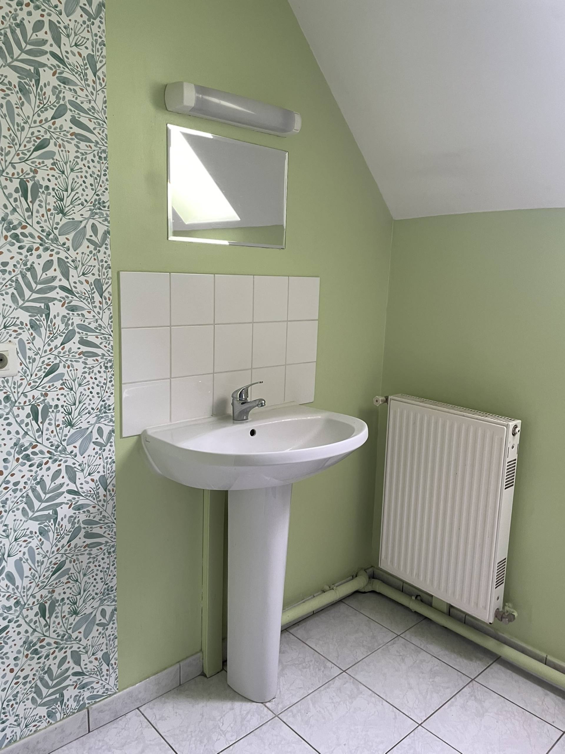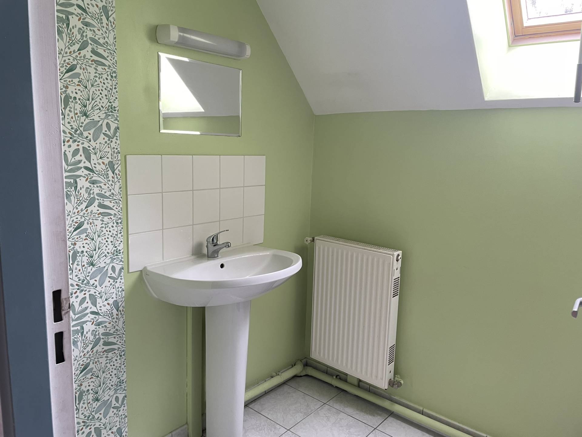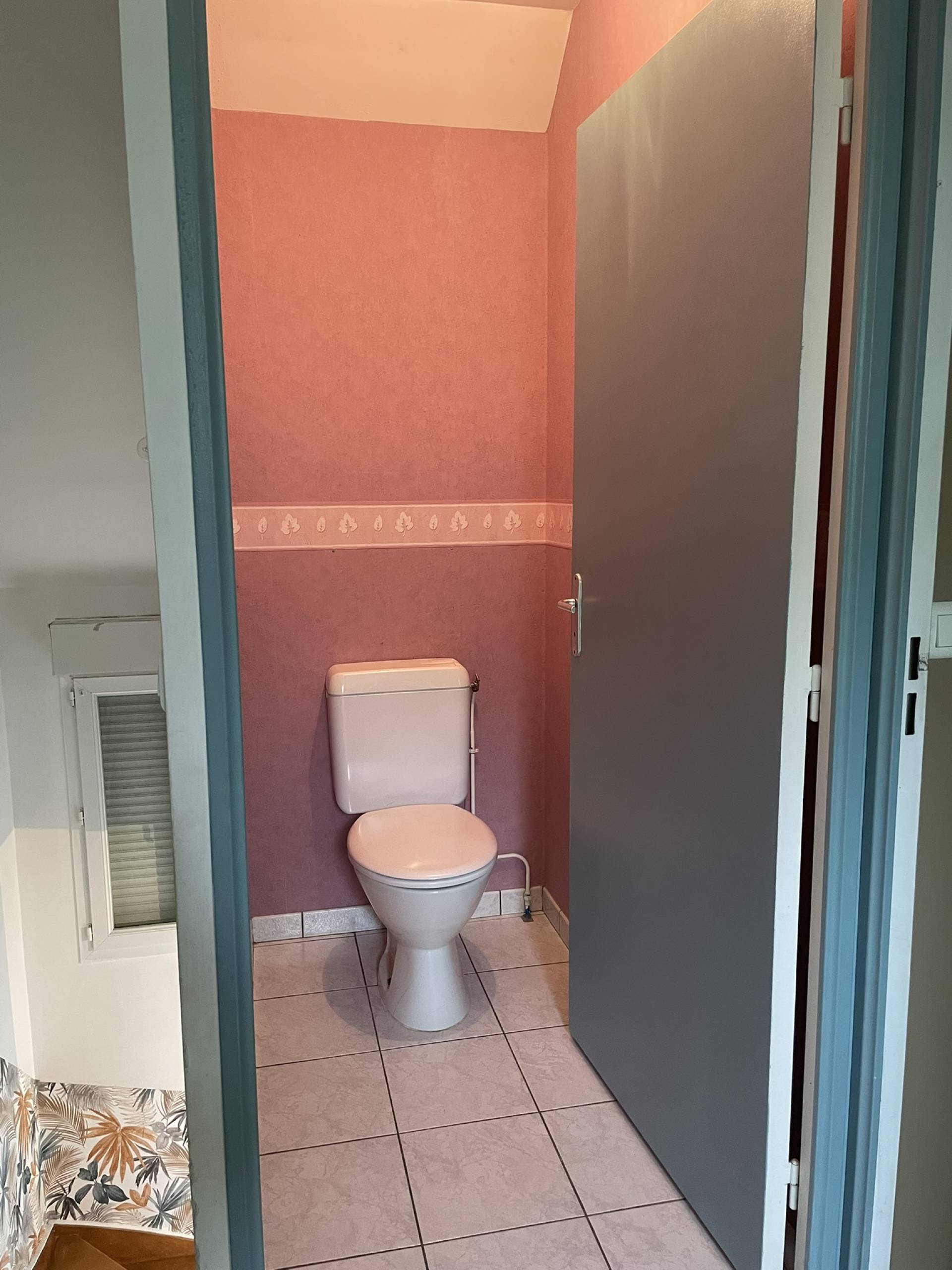 Etage : pallier desservant 2 chambres, salle de bains, wc